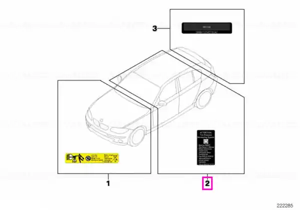 Eticheta este un element original utilizat pentru afișarea datelor impuse de producător sau de legislația europeană. În funcție de modelul autoturismului, poate include informații despre siguranță, utilizare, presiuni, valori tehnice sau alte specificații relevante pentru vehicul, precum și datele de identificare au autoturismului. Materialul este durabil și rezistent la temperatură, umezeală și uzură, astfel încât textul să rămână clar și lizibil în timp. Eticheta se aplică pe poziția prevăzută din fabrică și se montează fără adaptări.